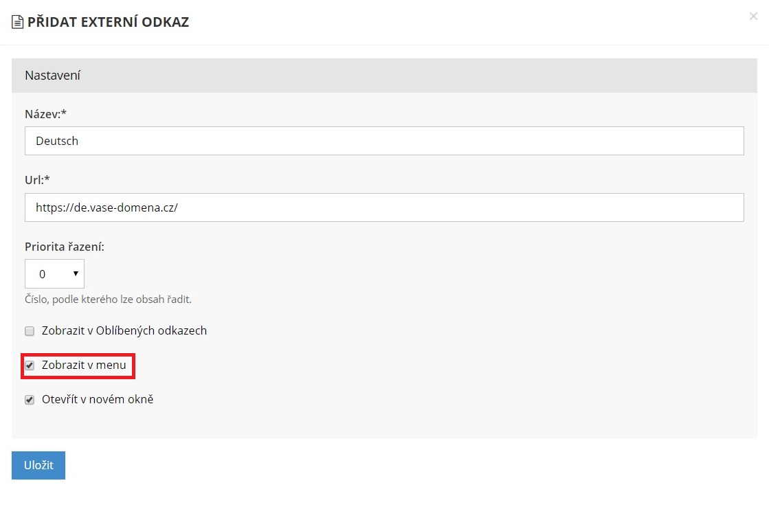 Na kartě Přidat externí odkaz vyplníme povinné parametry Název a Url. Název volíme příznačně podle jazykové verze. V poslední řadě zaškrtneme volbu Zobrazit v menu a uložíme.