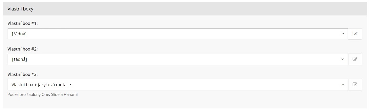 4. Nakonec je nutné nastavit, aby se stránka zobrazovala ve vlastním boxu. To učiníme následujícím způsobem: Nastavení → Nastavení prvků do vlastního boxu. Zde z paletky vybereme název naší stránky s vlaječkami. Tímto docílíme zobrazení vlaječek na webu ve vlastním boxu. Konkrétní polohu vlaječek upravíme s pomocí vlastních CSS. Umístění vlaječek do boxu je závislé na použité šabloně. V samostatném článku jsou uvedeny podrobnosti, do jakého boxu je vhodné vlaječky umístit.