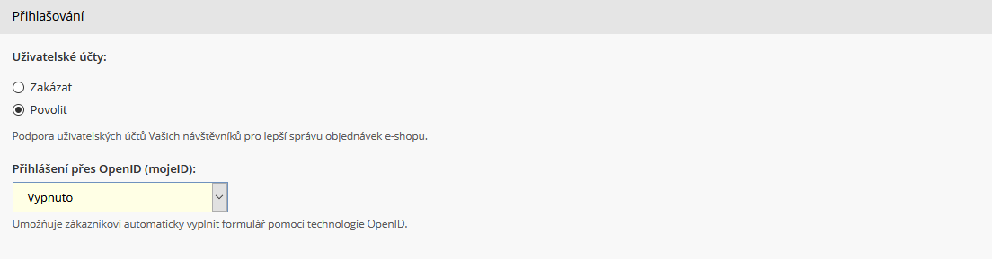 Aby bylo možné zákazníkům umožnit registraci do vašeho e-shopu, je třeba tuto funkci nejprve zapnout. Povolení registrace zákazníků provedete v sekci Eshop pod položkou Nastavení eshopu. Zde je nyní nově rozhraní pro aktivaci registrace zákazníků do e-shopu.