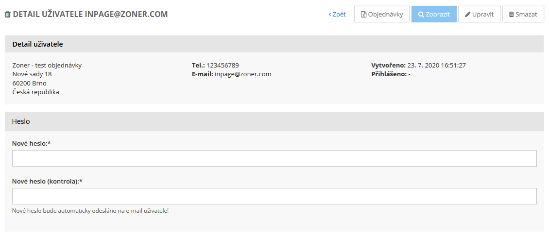 V neposlední řadě máte možnost změnit heslo, anebo zákaznický účet ručně odstranit. Odstraněním účtu však nedojde ke smazání objednávek pouze ke smazání vazby objednávek na tohoto uživatele.