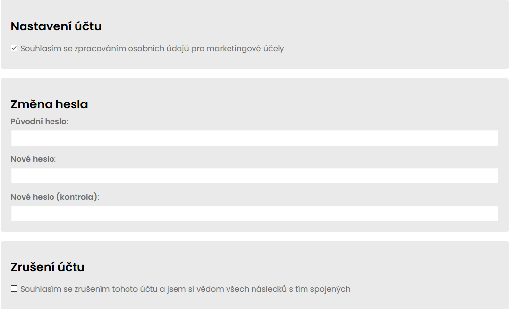 Samozřejmostí je možnost změny hesla, odhlášení odběru novinek a taktéž možnost zrušit vytvořený účet.