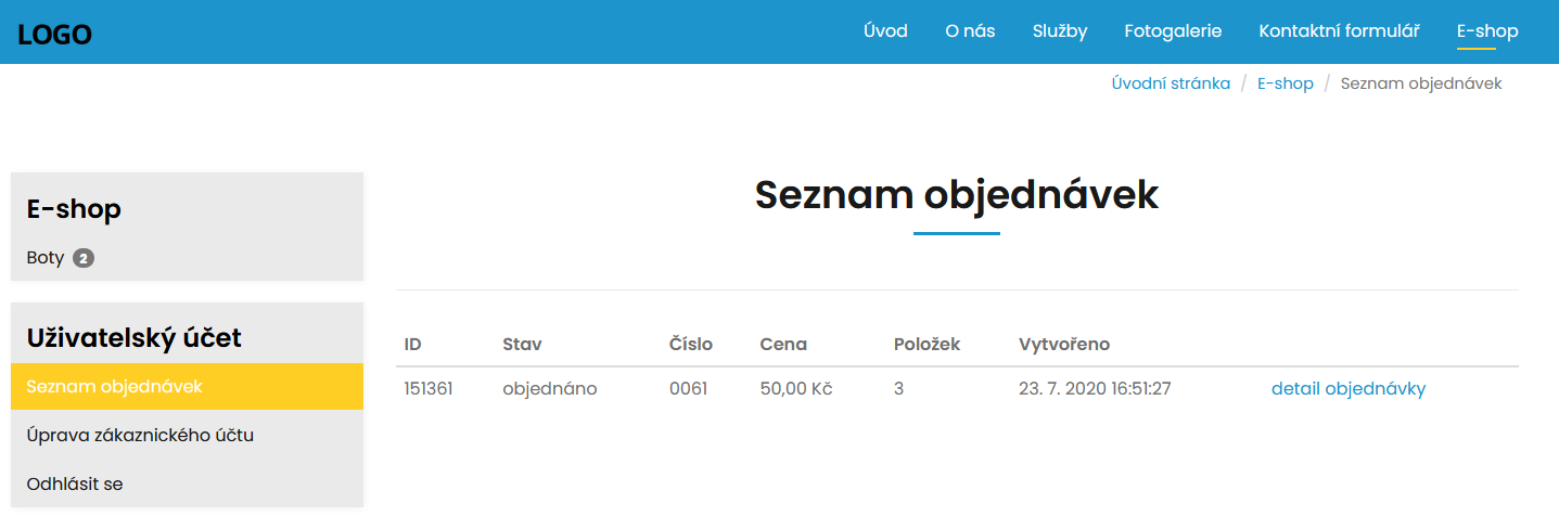 Po přihlášení se na zákaznický účet má zákazník k dispozici přehled provedených objednávek, dále pak možnost upravit své kontaktní a fakturační údaje.
