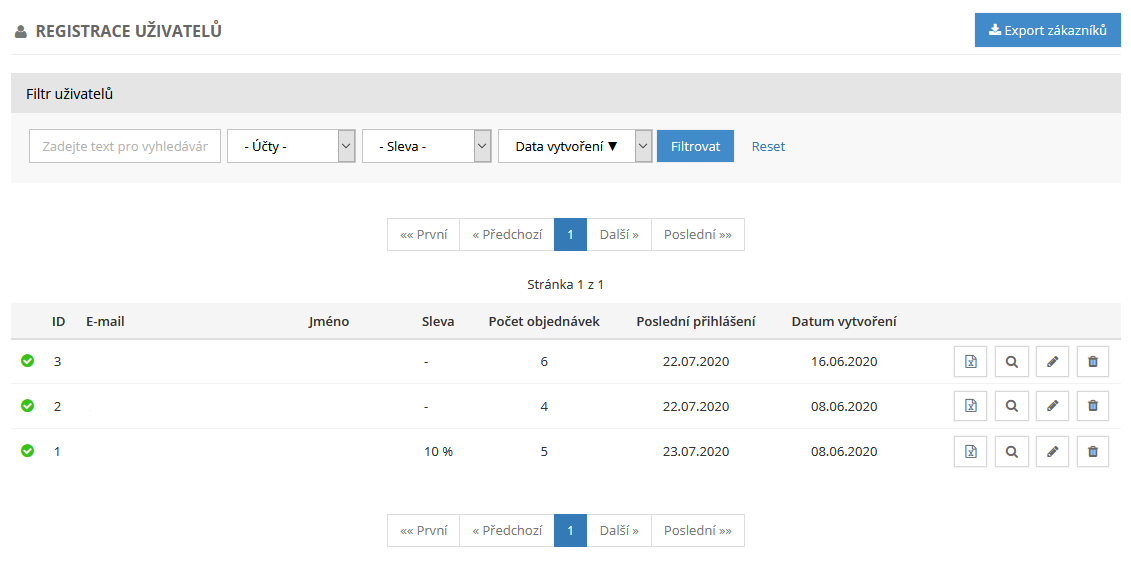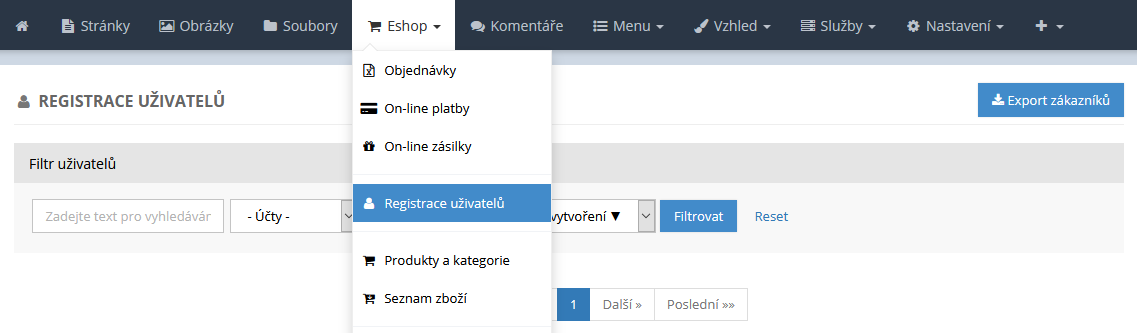 Jednotlivé zákaznické účty můžete snadno spravovat v administraci webových stránek a to v sekci Eshop pod položkou Registrace uživatelů.