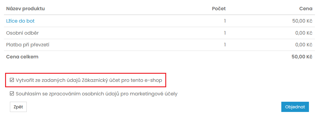 Uživatelský účet si Vaši zákazníci vytvoří velice snadno a to přímo v objednávce. Stačí vyplnit potřebné kontaktní a fakturační údaje a před dokončením objednávky potvrdit možnost Vytvořit ze zadaných údajů Zákaznický účet.