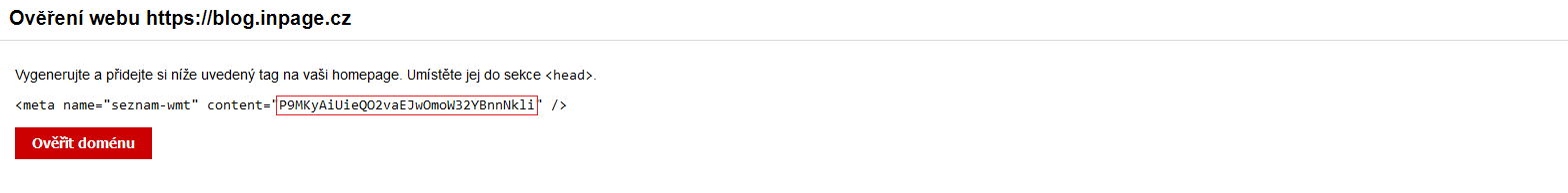 Zkopírujte si část HTML kódu obsahující řetězec content ="vzorretezceproovereniwebu" viz obrázek níže.