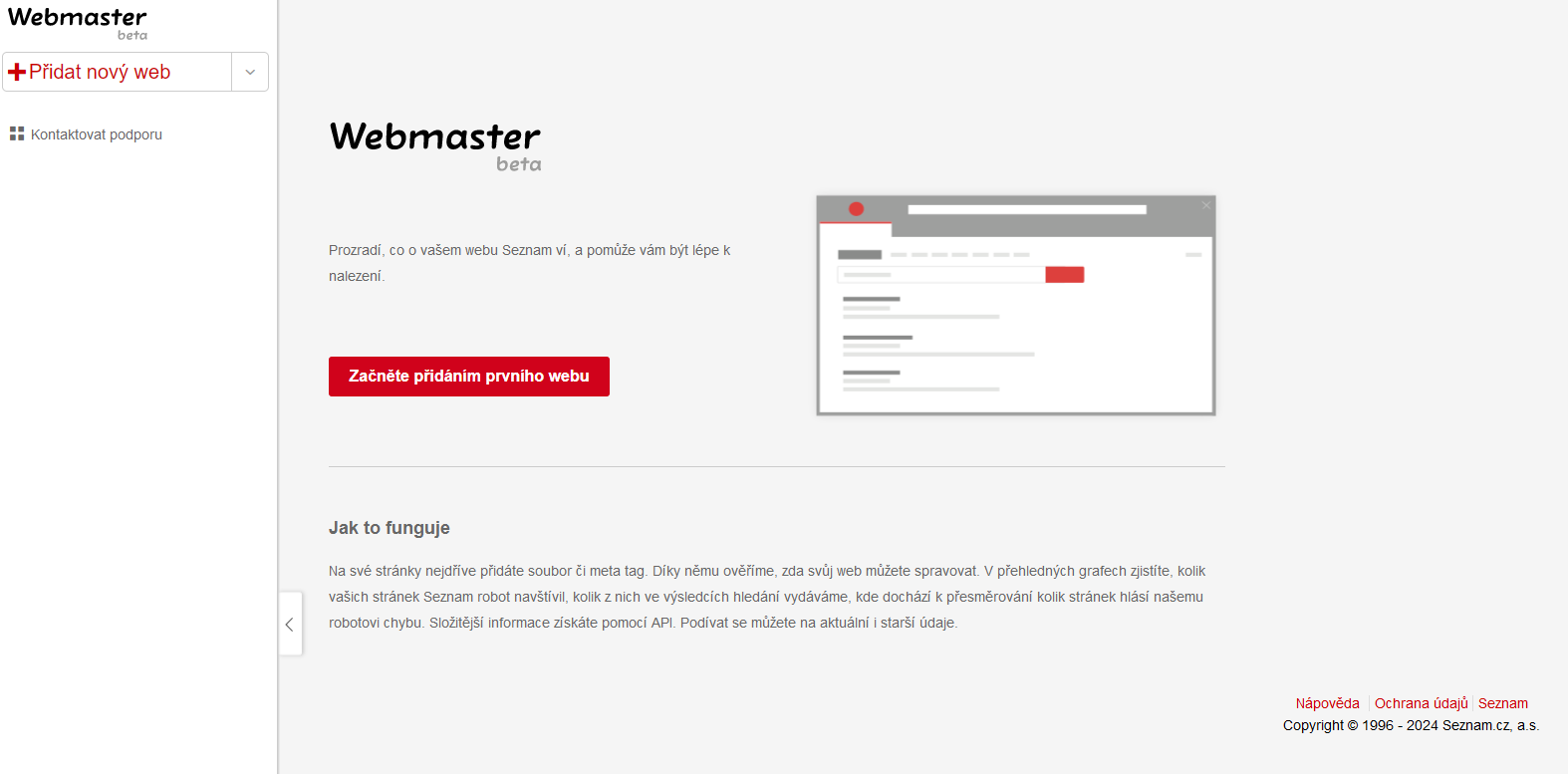 Jedná se o službu podobnou Google Search Console určenou pro vyhledávač seznam.cz. Abyste službu mohli využívat, je třeba se do ní registrovat a následně ji propojit s vaším webem.