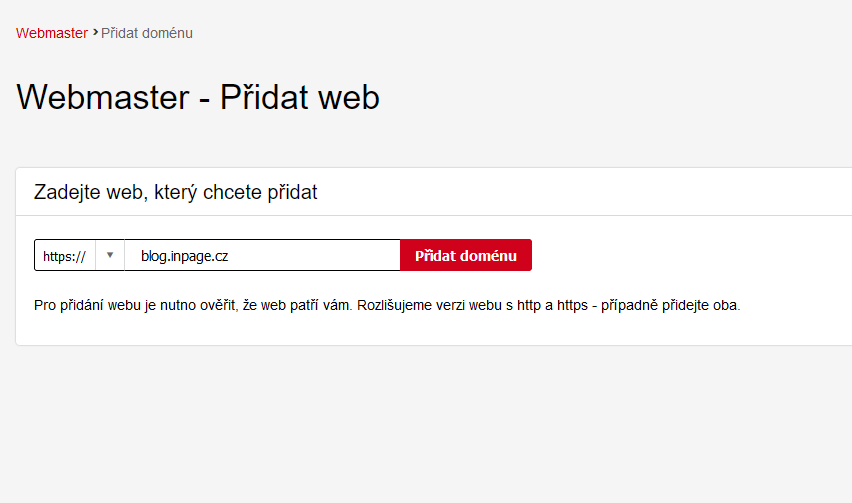 Po prvním přihlášení se do služby Seznam Webmaster je po vás vyžadováno zadání názvu domény, kterou chcete do služby přidat.