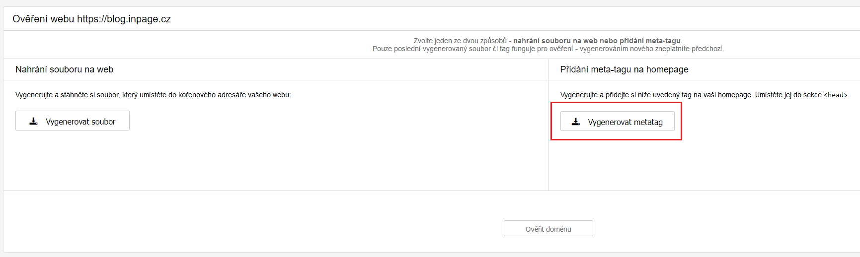 Poté jste vybídnuti k ověření domény - propojení vašeho webu se službou webmaster. Jako způsob ověření vyberte možnost Přidání meta-tagu na homepage.