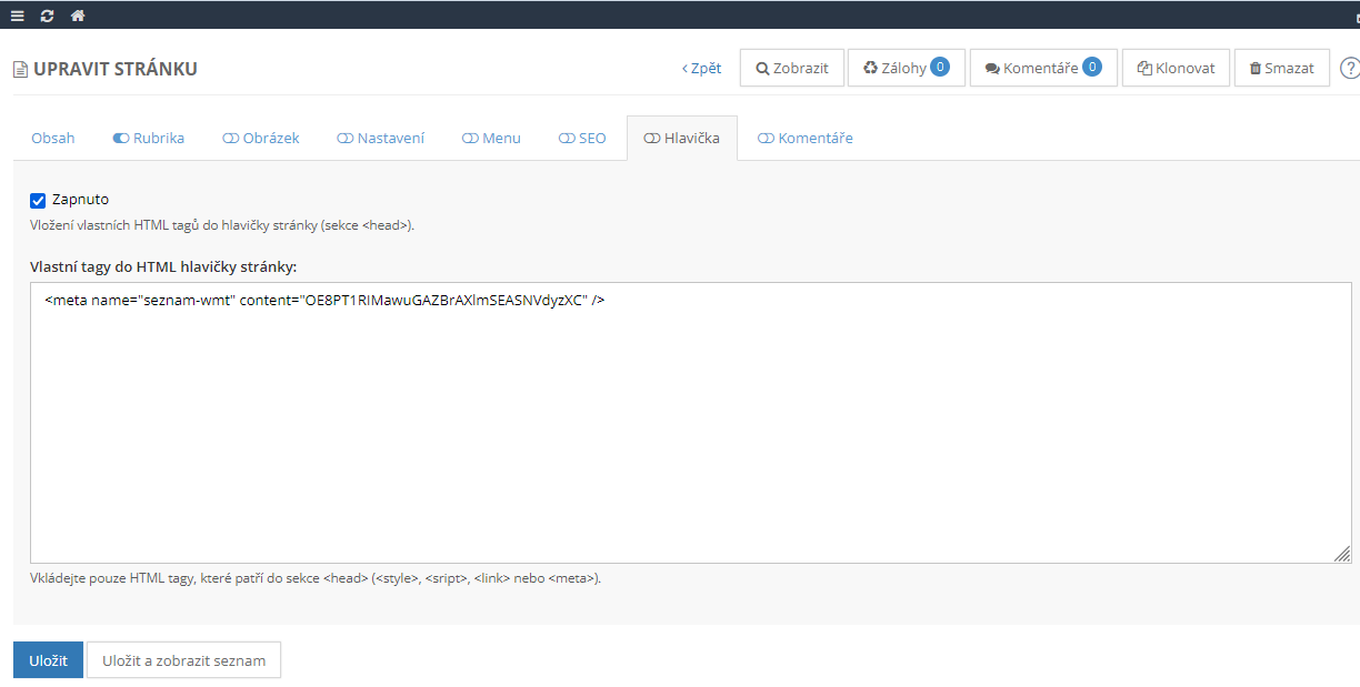 Následně zvolíte záložku /Webmaster/, kliknete na Zapnout a do volného pole vložíte zkopírovaný řetězec a nakonec nastavení uložíte.