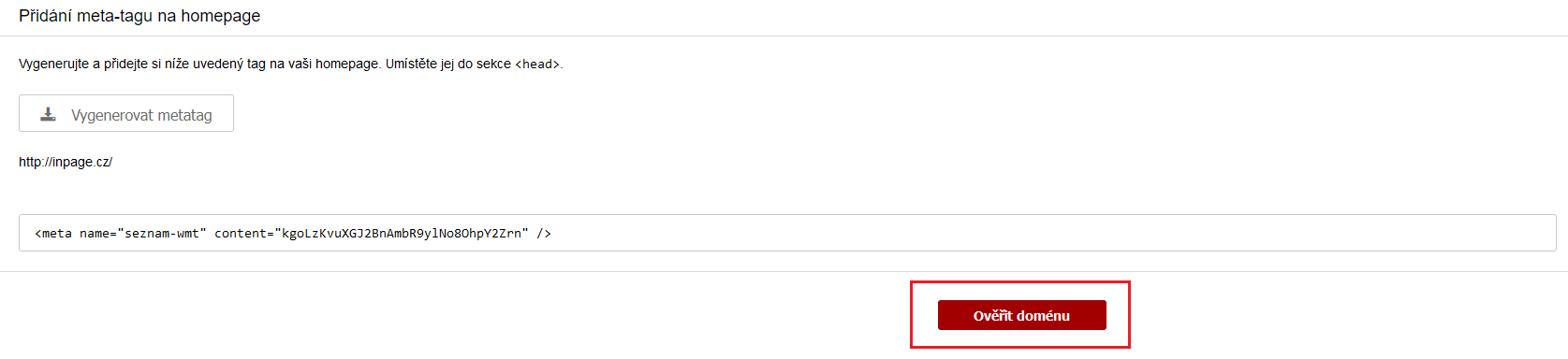 Poté přejděte opět do rozhraní Webmaster a potvrďte ověření kliknutím na tlačítko Ověřit doménu.