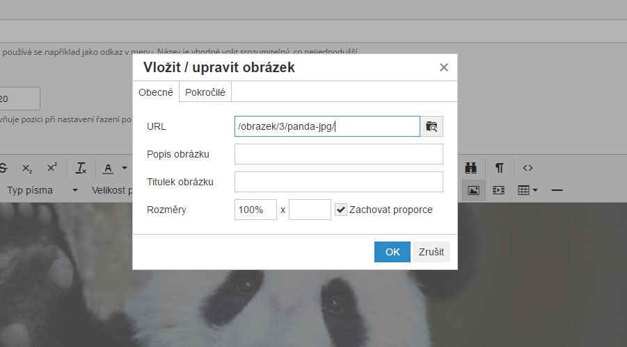 Při vkládání médií do stránek inPage si volíte zároveň jejich velikost. Každý z nahraných obrázků se do systému uloží ve čtyřech různých velikostech, o kterých si můžete přečíst více v článku Obrázky v inPage - velikost a použití nejen s novým WYSIWYG editorem. Pokud chcete, aby se obrázek nedeformoval, lze již tady zadat hodnotu 100%. Do pole šířky napíšete hodnotu 100%, druhé pole necháte prázdné a zaškrtnete Zachovat proporce. Při tomto nastavení bude prvek responzivní, ale bude se zobrazovat na celou šířku stránky i na velkých monitorech.