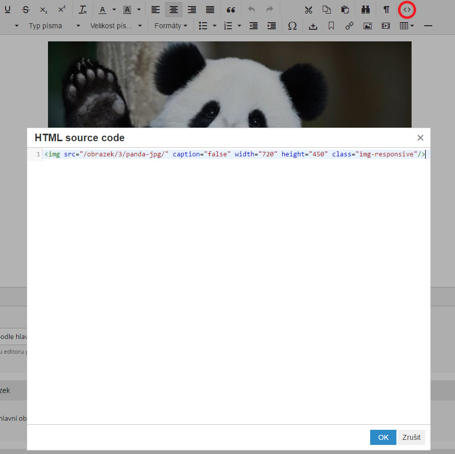 Dalším způsobem, je přiřazení třídy img-responsive konkrétním prvkům v HTML editoru. Ve WYSIWYG editoru je HTML editor přístupný z červeně označeného tlačítka na obrázku. Třída img-responsive má 100% maximální šířku již předdefinovanou z frameworku Bootstrap, který využívají všechny inPage responzivní šablony. Nemusíte si tedy definovat vlastní.