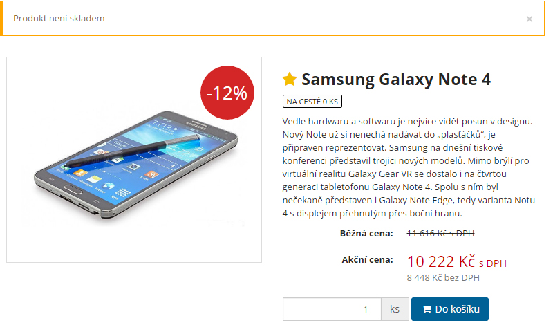 Pokud nepovolíte možnost objednat si produkt, který není skladem, zobrazí se po kliknutí na tlačítko Do košíku upozornění, že produkt není skladem, a do košíku se nepřidá.