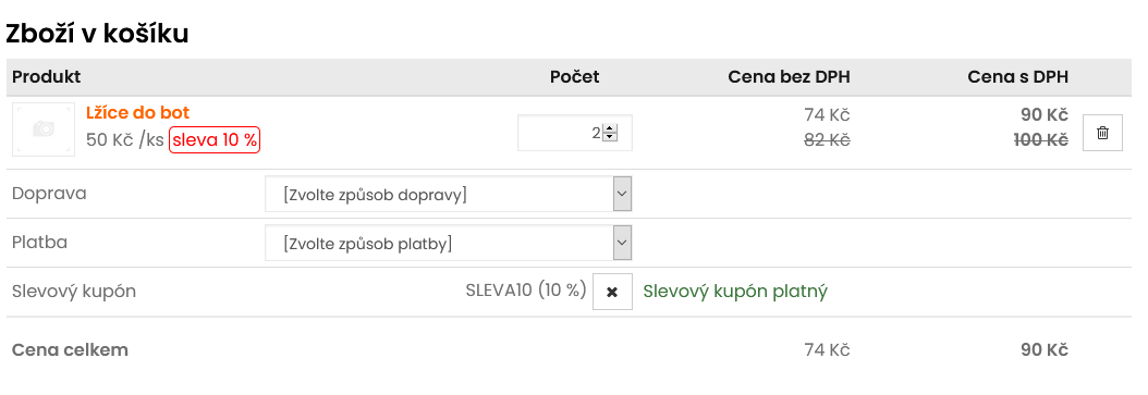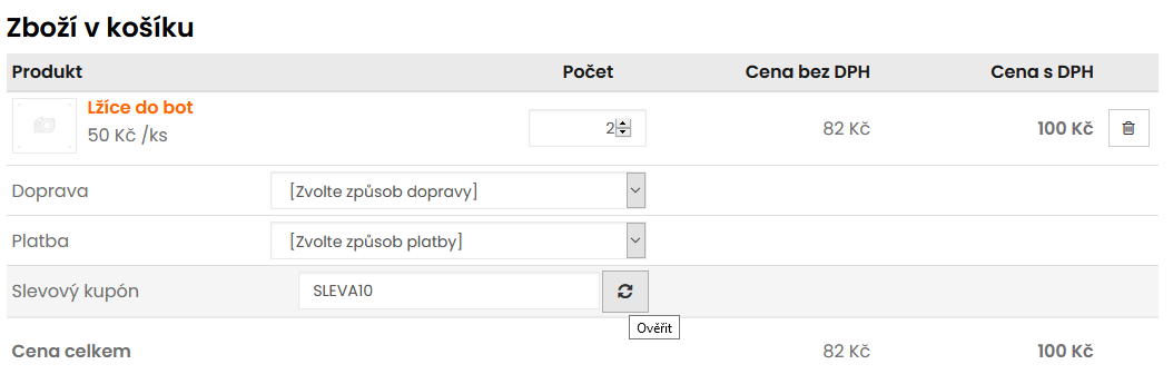Ve chvíli, kdy Vytvoříte slevový kupón, tak se vašim zákazníkům v objednávce e-shopu začne zobrazovat pole pro vložení kupónu. Pokud žádný slevový kupón nemáte vytvořen, pole pro vložení kupónu se v objednávce nezobrazuje.