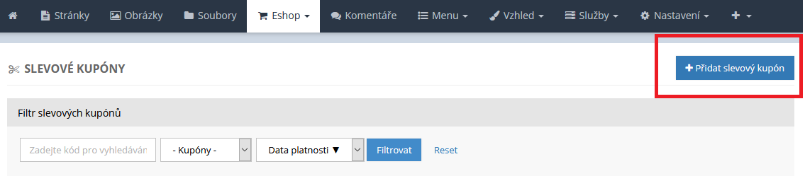 Zde je k dispozici jednoduché rozhraní pro vytváření nových, či správu již aktivních slevových kupónů. Nový slevový kupón aktivujete kliknutím na tlačítko Přidat slevový kupón.