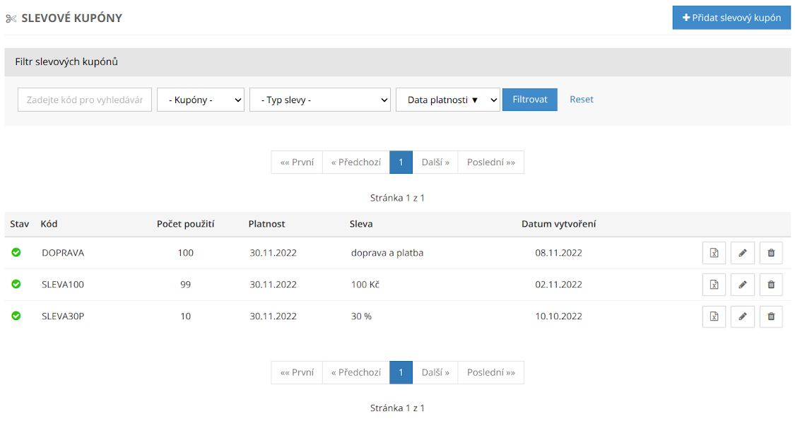 Ve stejnou dobu můžete mít v e-shopu aktivováno vícero slevových kupónů. Jednotlivé kupóny upravujete opět v rozhraní pro Slevové kupóny.
