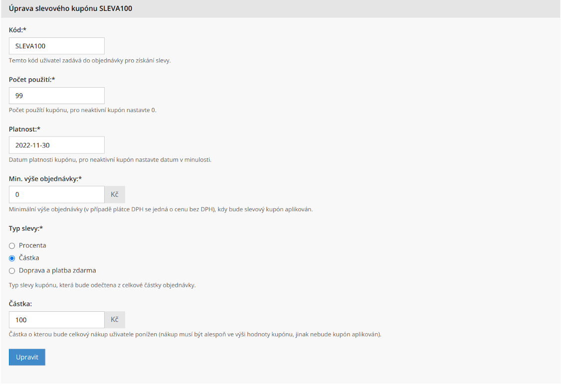 V jednoduchém rozhraní pro správu slevových kupónů můžete nastavit kupónu tyto parametry:
