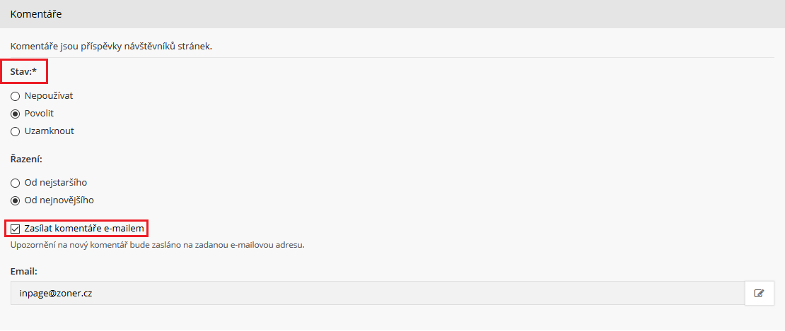 To, aby mohli návštěvníci vašich stránek přidávat komentáře, můžete nastavit vždy u konkrétní vámi vytvořené stránky, galerie, či produktu a to v jejím detailu v sekci Komentáře, kde si zvolíte možnosti, jak budou komentáře na konkrétní stránce dostupné a zdali se vám budou také zasílat i na e-mail.