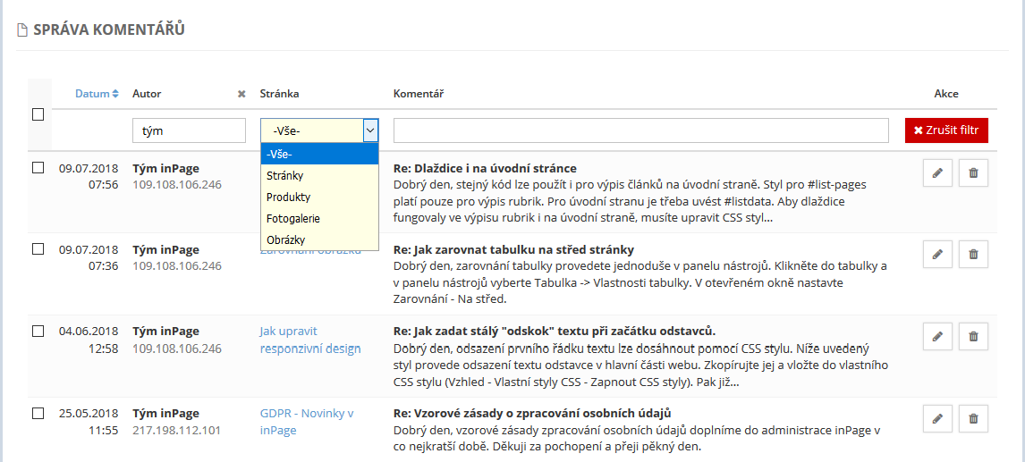 Samotnou správu komentářů, které návštěvníci zanechali na vašem webu, naleznete v hlavním menu administrace webových stránek pod položkou Komentáře.