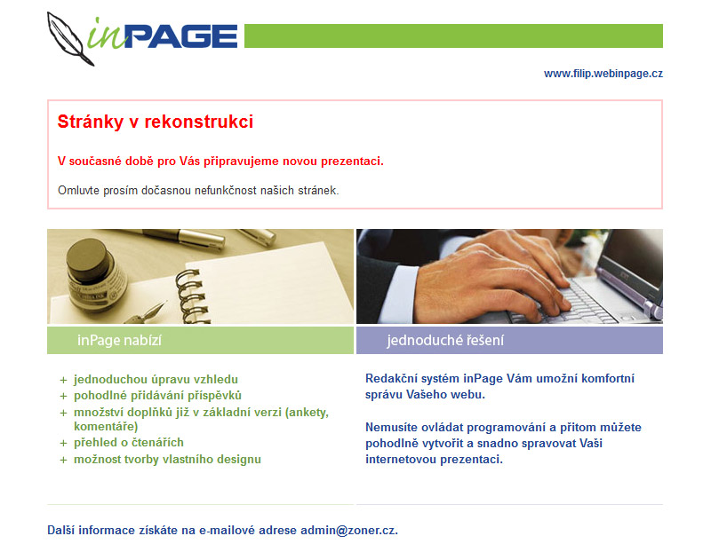 Pokud upravujete své webové stránky inPage a nechcete, aby je ještě někdo viděl, můžete si v administraci zaškrtnout možnost stránky v rekonstrukci.
