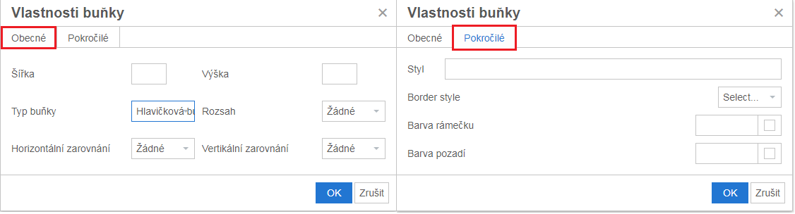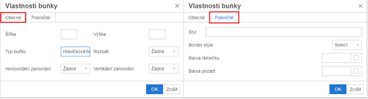 Ve Vlastnostech buňky nastavujeme hlavičkové buňky nebo měníme velikost, barvu pozadí atd.