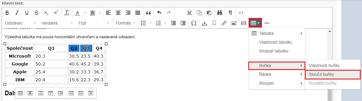 Pod položkou Tabulka → Buňka můžeme buňky tabulky sloučit nebo opětovně rozdělit. Buňky je třeba předtím označit.