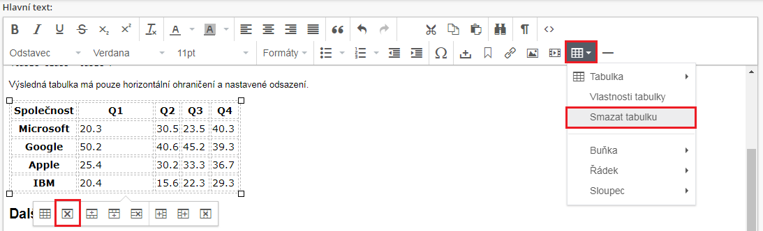 Jednoduché je i odstranění tabulky. Stačí na ni kliknout a vybrat v menu položku Tabulka → Smazat tabulku nebo použít ikonu v rychlém menu