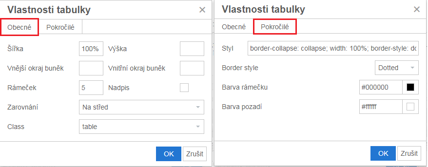 Úpravy provádíme ve vlastnostech tabulky ikona Tabulka → Vlastnosti tabulky. Tabulce můžeme nastavit šířku, výšku, tloušťku čáry, odsazení textu, či pokročilé úpravy jako je nastavení barvy ohraničení a pozadí.