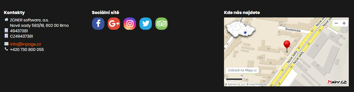 Patička je v šabloně KYRA mnohem více variabilní než v šabloně HANAMI. Lze v ní zobrazit kontakty, oblíbené odkazy, sociální sítě a vlastní stránku jako vlastní box 3. Pokud některý ze jmenovaných bloků nezobrazíte, ostatní se automaticky roztáhnou. Jediný blok s kontakty dodržuje svou šířku. Můžete tak například v patičce zobrazit jen kontakty s mapou ve vlastním boxu, nebo nezobrazovat kontakty a celou patičku si připravit dle svého ve vlastním boxu.