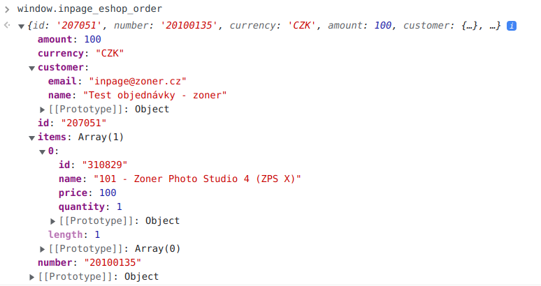 Pokud potřebujete integrovat konverzní kód od systému, který inPage nepodporuje (např. FAVI, Biano Pixel, aj.), je to také v inPage možné. Základním prvkem, který k tomu slouží, je nově generovaný javascriptový objekt inpage_eshop_order globální javascriptové proměnné window, který se generuje do každé stránky detailu objednávky uživatele (viz. příklad vypsaný v Google Chrome Console):