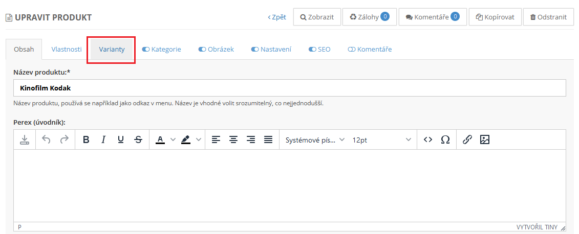 Pro přidání varianty produktu si stačí zobrazit detail již vytvořeného produktu a zde vybrat záložku /Varianty/.
