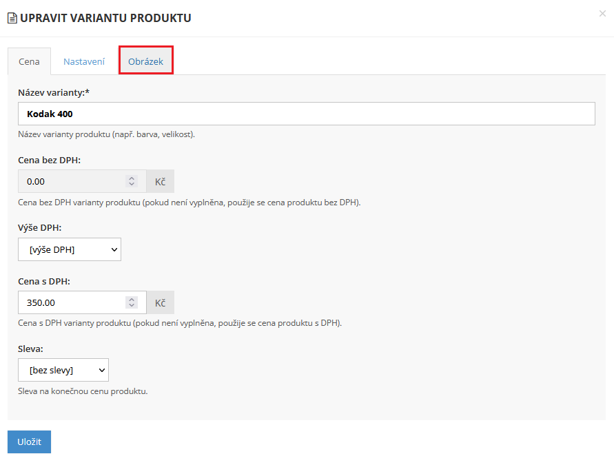 - Obrázek - zde vkládáte vlastní obrázek varianty produktu