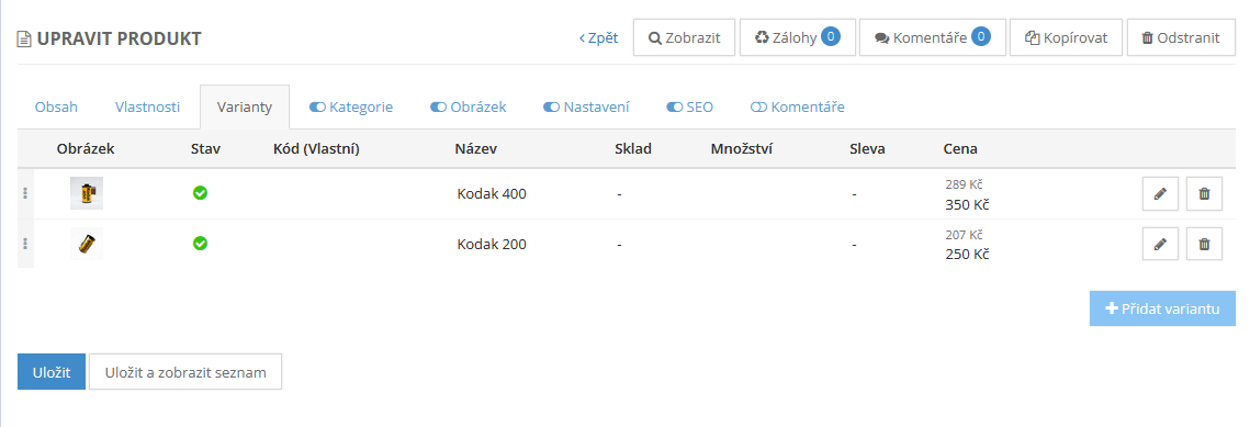 Zde můžete přidat jednotlivé varianty vašeho produktu a to jednoduše kliknutím na tlačítko "Přidat variantu" V případě, že již varianty produktu máte vytvořené, tak klikněte na upravit.