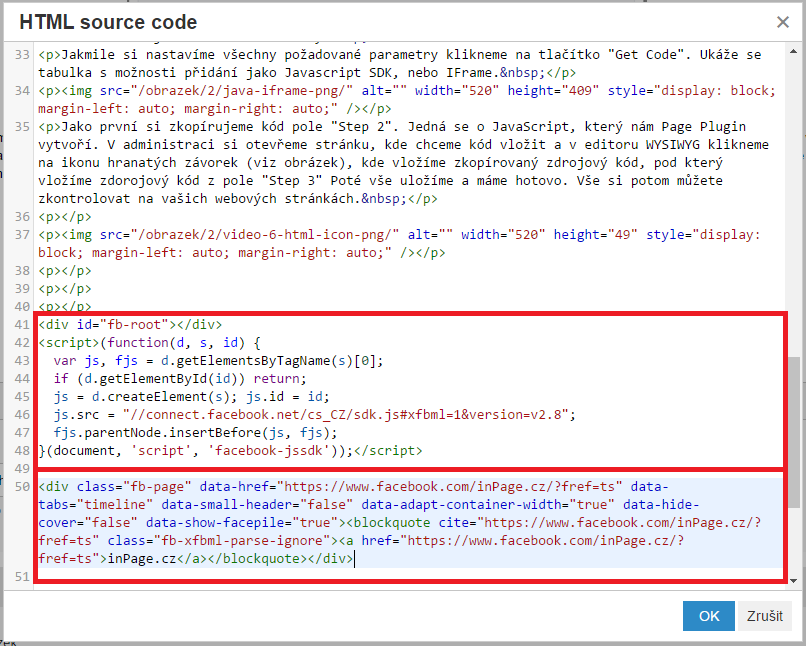 Pod něj vložíme zdrojový kód z pole "Step 3". Poté uložíme. Totéž platí pro IFrame (viz obrázky pod textem).