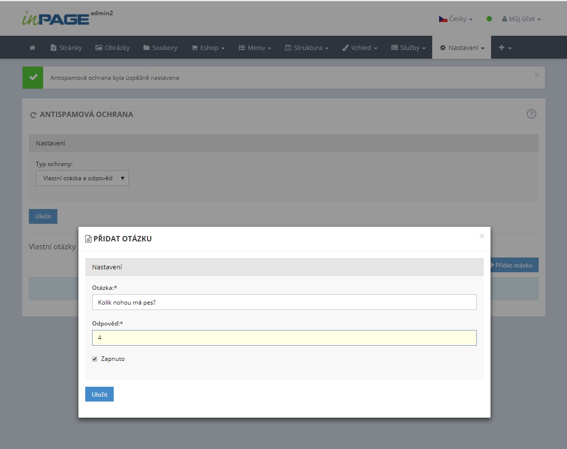 Otázku nastavíte v menu NASTAVENÍ -> Antispamová ochrana a ve výběru vyberete Vlastní otázka a odpověď. Aby se vám otázky na webu zobrazily, musíte zaškrtnout ještě vlastní otázka a odpověď a potvrdit modrým tlačítkem Upravit.