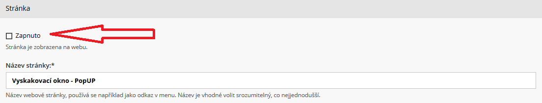 Stránku nastavte jako neaktivní, tedy aby se nezobrazovala na webu. Je to z toho důvodu, aby se vám stránka zbytečně nepropisovala do mapy webu a neindexovala do vyhledávačů. Nicméně zobrazení vyskakovacího okna to neovlivní. Nezapomeňte stránku nakonec uložit.