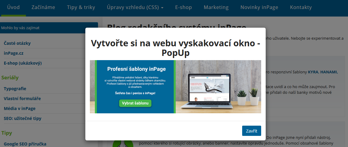 Chtěli byste návštěvníky vašich stránek informovat o nějaké novince, či slevě ihned při vstupu na webové stránky? K tomuto účelu slouží tzv. PopUp, neboli "vyskakovací okno". V tomto článku si ukážeme, jak jednoduché je PopUp okno na webu v inPage nastavit.