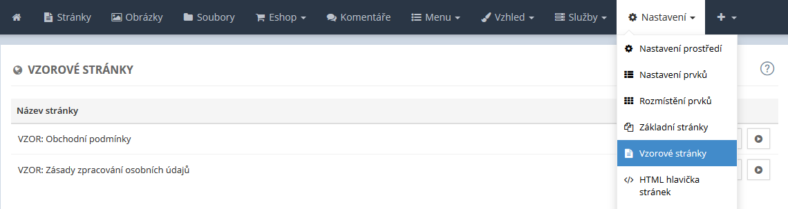 Tyto vzorové stránky naleznete v menu nové administrace v sekci Nastavení → Vzorové stránky. Po otevření této nabídky se vám zobrazí výčet vzorových stránek.