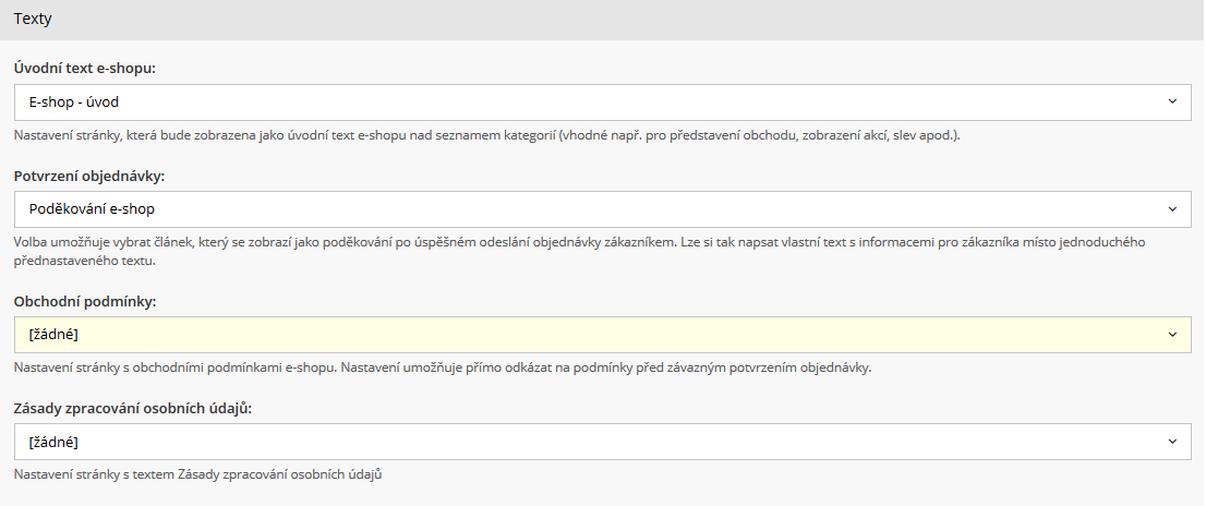 Na závěr stačí podmínky uložit a v nastavení e-shopu je v části Texty vybrat jako obchodní podmínky vašeho e-shopu. Nastavení umožňuje přímo odkázat na podmínky před závazným potvrzením objednávky.