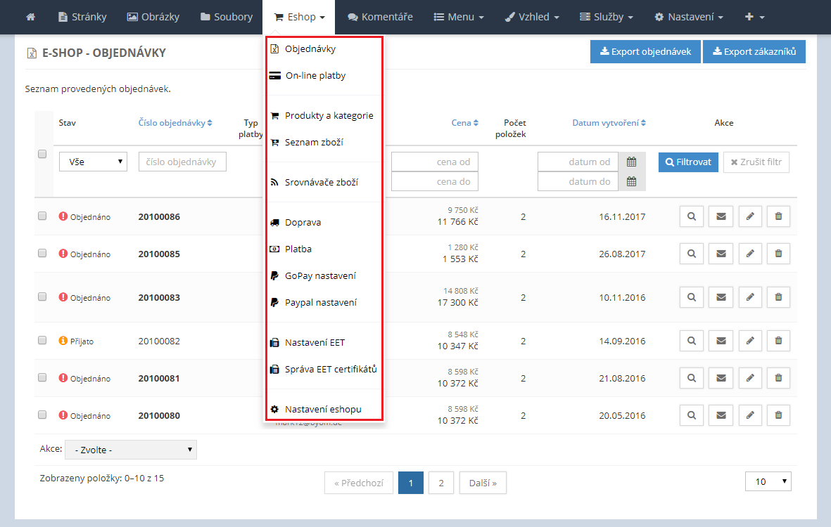 E-shopové řešení je v inPage tvořeno se záměrem co nejjednodušší správy a nastavení. V sekci e-shop máte k dispozici odkazy potřebné ke správě objednávek, tvoření produktů a jejich kategorií, k zobrazení seznamu zboží, nastavení srovnávačů zboží, nastavení platby, dopravy a samotného e-shopu.
