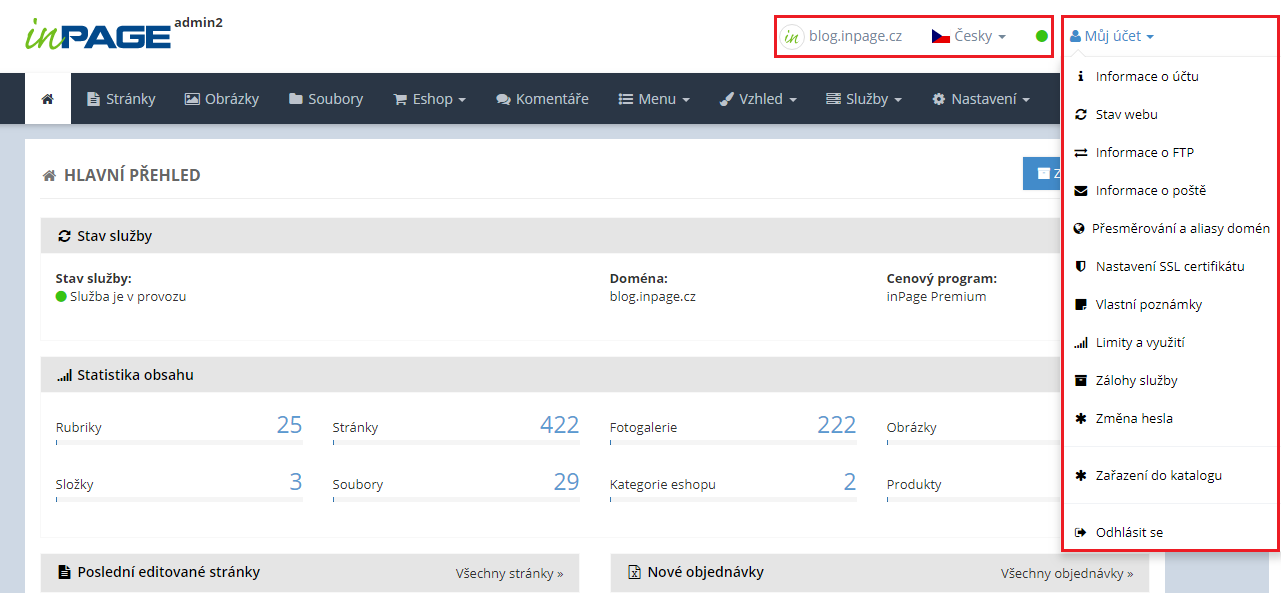 Hned po přihlášení si všiměte v hlavičce administrace vpravo jsou: