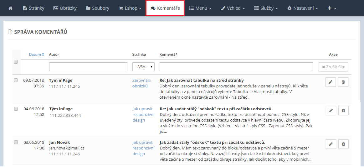 V této sekci lze spravovat, upravovat či mazat komentáře u článků, obrázků či produktů. Možnost komentářů lze zapnout v editaci jednotlivých prvků.