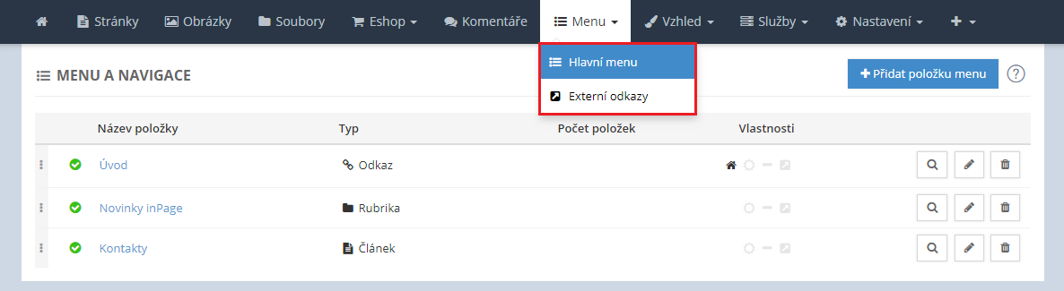 Jak si vytvořit menu a jak s ním následně pracovat se dočtete v článku Nastavení hlavního menu.