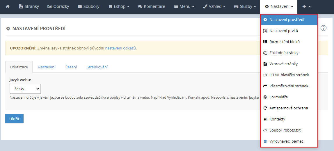 - jazyk administrace, kde jsou k dispozici zatím základní překlady do slovenštiny, agličtiny, němčiny, maďarštiny a polštiny