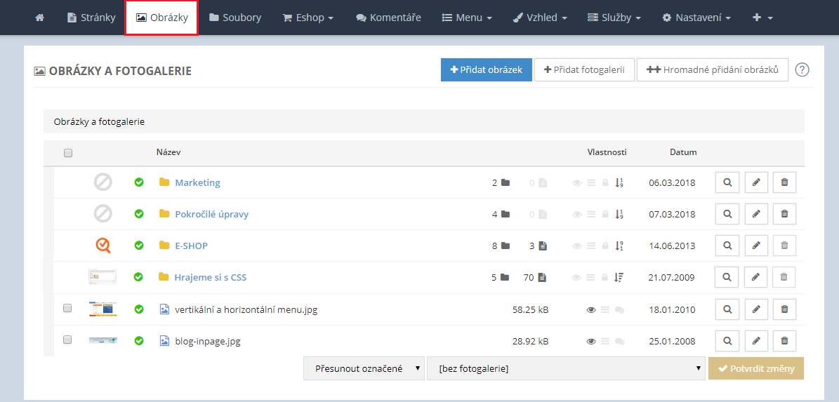 Sekce Obrázky je určena pro nahrávání obrázků a tvorbu fotogalerií. Obrázky i fotogalerie mohou být použity jako součást článku nebo lze zobrazit přehled všech fotogalerií na webu. Dokonce můžete fotogalerii připojit i k článku či k produktu v e-shopu. Odkaz na kompletní fotogalerii lze také nastavit do hlavního menu.