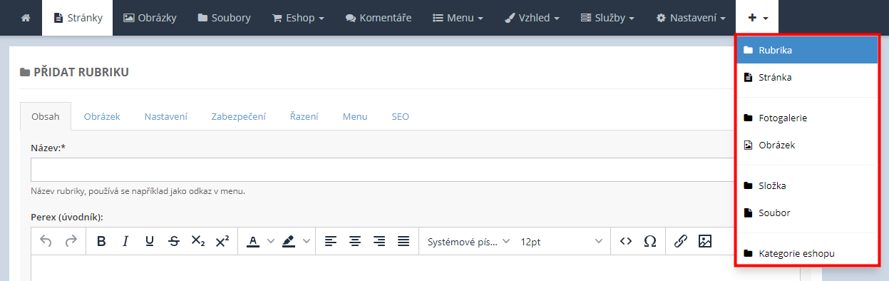 Podrobný návod pro správu stránek a rubrik naleznete v článcích Práce se stránkami a Práce s rubrikami.