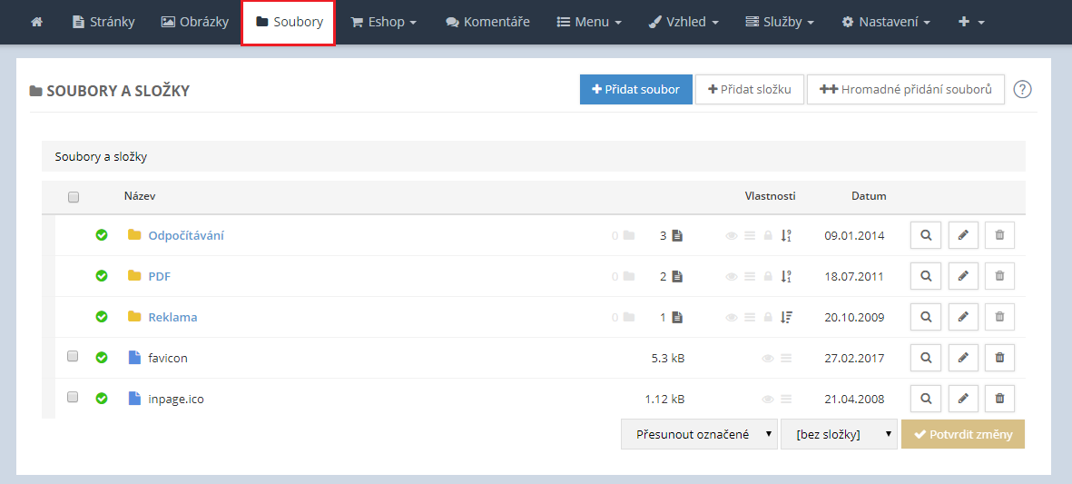 Nahrávání souborů a vytváření složek se soubory provedete v sekci Soubory. Následně můžete soubory na webu zobrazit jako soubor ke stažení nebo nastavit jejich zobrazení přímo v prohlížeči. Video a hudební soubory následně můžete zobrazit přímo na konkrétní stránce.