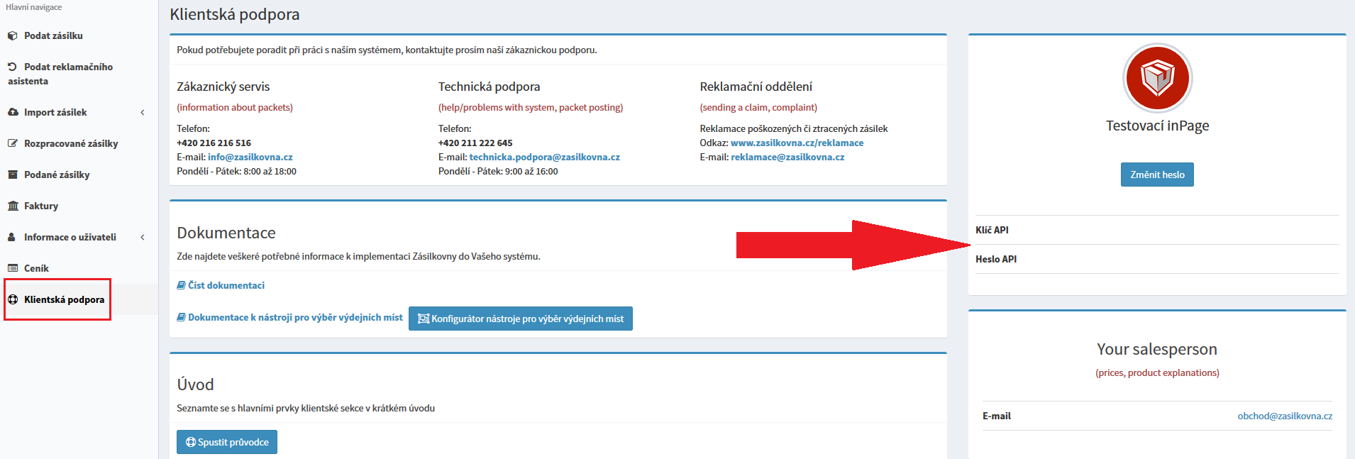 K propojení služby zásilkovna a e-shopu na inPage slouží klíč API a k němu vázané heslo API. Tyto údaje najdete v administraci služby Zásilkovna v sekci Klientská podpora.