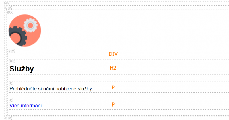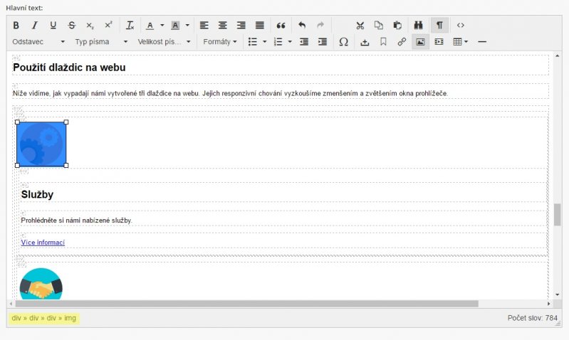 V kolika prvcích je daný text či obrázek obalen je uvedeno i na spodním panelu editoru. Když si kliknete například na obrázek nad nadpisem Služby, můžete vidět, že je obalen celkem třemi divy (viz obrázek níže).